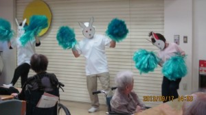 2013.09.22 シルバービレッジ八王子西 十五夜・なぞのうさぎ軍団八王子西へ 9月17日火曜日午後より、職員による十五夜のお月見イベントをおこないました。 寸劇「ウサギの餅つき」です。最初 うさぎ跳びをしながら舞台に登場します。十五夜の日に 餅をついて それを食べた兄妹は、ウサギになってしまい ぺったん ぺったん餅をつくというストーリーです。最後に ウサギのダンスを踊って・・・大好評でした。 お茶の時間には、ウサギのお饅頭を召し上がって頂き楽しいひと時を過ごしました。 介護部 宍戸房子