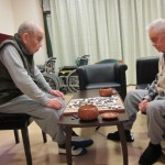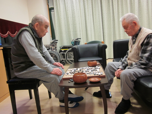 2013.11.05 シルバービレッジ八王子西 八王子西 囲碁日本シリーズ開幕 八王子西では、毎日2人のご入居者が、熱心に囲碁をされています。おやつの時間から 夕食まで、「好きだから やっているんだよ。定年退職後に 教えてもらったんだ!毎日 碁を打つのが 楽しみでね~」「囲碁講座の本が、シルバービレッジにあるから読んで 研究しているんだ。」と笑顔で 語ってくれました。 介護部 宍戸房子