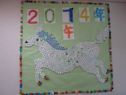 2014.03.12 シルバービレッジ八王子西 創作レクレーション 創作レクレーションンで ペットボトルのキャップを使い 今年の干支の馬を作りました。入居者の皆様に1月から頑張って頂きやっと完成しました。見事な出来栄えで 1階の廊下に 貼ってあります。 介護部 岩崎みつ子 中野絹代