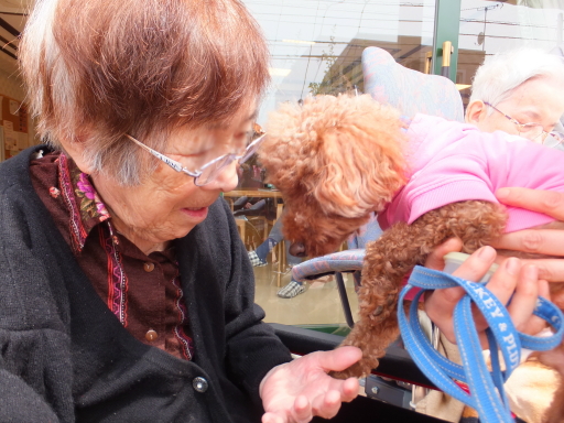 2014.04.15 シルバービレッジ八王子 4月13日にアニマルセラピーがありました。 4月13日にアニマルセラピーがありました。 ボランティアの方々が、かわいいワンちゃんを連れて来てくれました。 愛おしそうに抱きしめる方、かわいいのだけれど、手が出せないでいる方・・・。 皆さま、癒された表情をされていました。 2グループ 山上 恭一