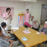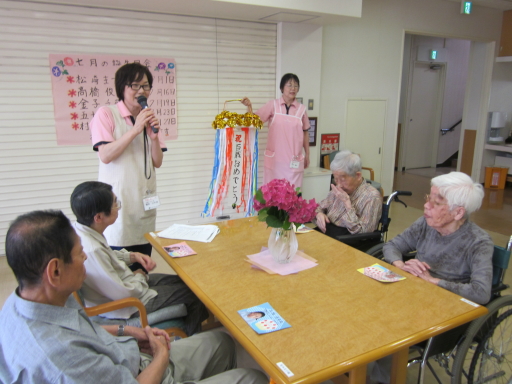 7月のお誕生日会を7月6日(日)1階ホールにて行いました。今月のお誕生日の方は、5名です。その中に大正3年7月23日生まれで 100歳になられる方がいらっしゃいます。