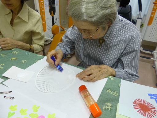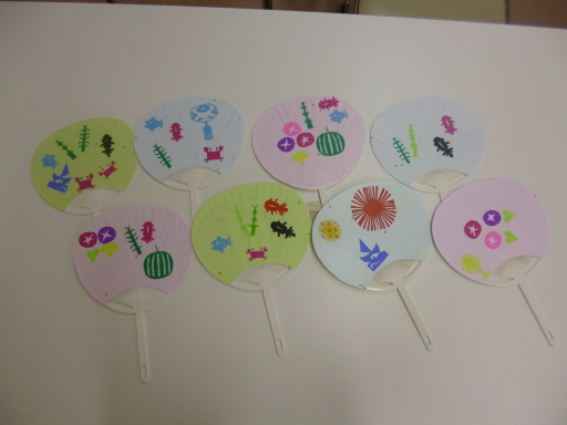 2014.07.11 シルバービレッジ八王子 ==手作りクラブ== ==手作りクラブ== 7月5日(土)手作りクラブにて、うちわの制作を行いました。 うちわに、夏の風物詩の切り絵をお好きな所に貼って頂き 【オリジナルうちわ】を作って頂きました。 貼る場所やどの切り絵を貼るかなどを、入居者様同士で楽しく 話しながら行っていました。 1階廊下の「遊びりテーション課」前に展示させて頂いています。 来園された際には、是非ご覧ください。 遊びりテーション課 大橋 由則