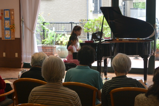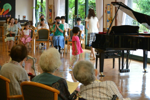 2014.08.13 シルバービレッジ日野 『八塚先生のサマー・ピアノコンサート』 『八塚先生のサマー・ピアノコンサート』 夏真っ盛りの日曜日、ピアノコンサートが行われました。 八塚先生には施設に長い間ピアノを演奏に来て下さり、入居者の皆様を和ませていただいております。 今回は、先生の生徒さんによるピアノ演奏会が行われました。 年齢層も男女幅広く、曲目もクラシックから映画音楽、唱歌とバリエーションに富んでおり、 普段と違った趣でした。 曲目の最後には、先生が(ふるさと)を弾いて下さり、皆さんで歌い楽しい一時を過ごされました。 writer: 倉田 知章
