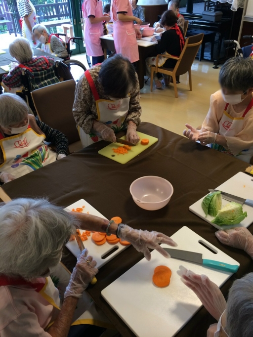 2014.09.17 シルバービレッジ八王子 皆さんと力合わせて美味しい料理作ります。 今日八王子の施設で料理教室がありました。入居者方々がコミニケーションを取りながら 頑張って野菜を切ってました。入居者様からの野菜の説明から始まり、 とても雰囲気が良く楽しい料理教室だった思いました。 美味しいスープは完成したかな、、、 writer: 平野栄司