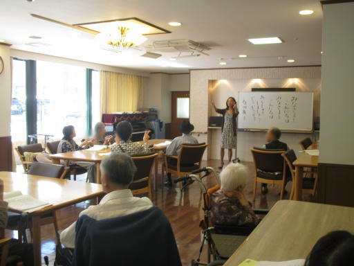 2014.10.17 シルバービレッジ日野東館 新しい先生 昨日は月に一度の「音楽療法」でした。 「音楽療法」とは・・・ 音楽を聞いたりした時の生理的・心理的な 効果を応用して健康の回復をはかります。 昨日からは新し先生がお見えになりご入居者の リクエストに応えて頂き楽しいひとときを過ごしました。 writer: 櫻井 葉月