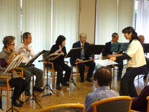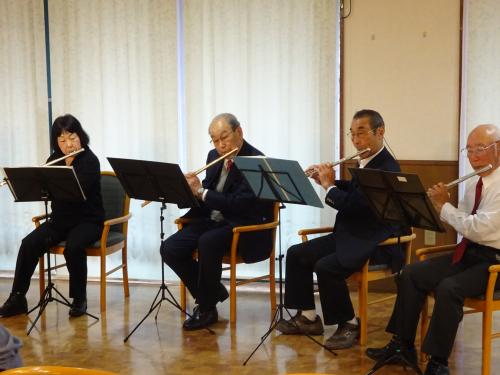 2014.11.13 シルバービレッジ日野 午後のレクリエーションに『国立フルートアンサンブル』の皆様が 午後のレクリエーションに『国立フルートアンサンブル』の皆様が 演奏に来られました。 今回は6曲を演奏され、その内の4曲は入居者様もご一緒に 歌われておりました!(^^)! 毎回素晴らしい演奏をありがとうございます♪ writer:介護部 冨樫