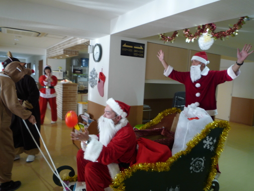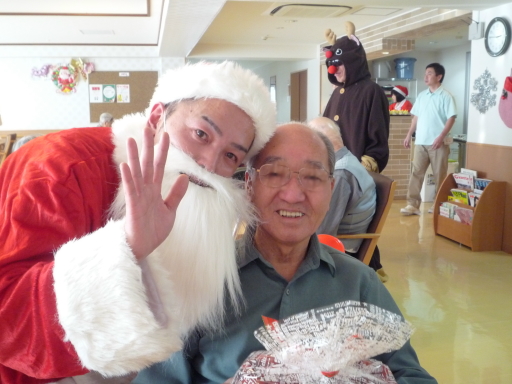 2014.12.26 シルバービレッジ八王子 ー クリスマス会 パート2 - ー クリスマス会 パート2 - クリスマス会のあと、皆様、ケーキを召し上がっていただきました。 このケーキのデコレーションは、手作りおやつとして、入居者の方が行っています。 美味しそうです。 職員の分は、ありませんでした・・・。 そして、いよいよサンタの登場!! 皆様にクリスマスプレゼントを配っていました。 因みに、職員の分は、ありませんでした・・・。 楽しい会になりました!! 2グループ writer: 山上 恭一