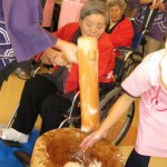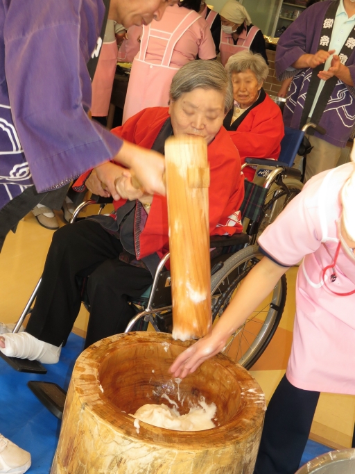 順番に、餅つき会場である1Fテラスとホールに来られ職員がついているのを、見学されたり、職員と一緒についたりされていました。