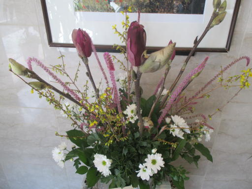 2015.02.19 シルバービレッジ日野東館 玄関ホールの顔 玄関ホールのお花の種類がかわりました! 今回はモクレン、レンギョウ、スプレーマム スターチススウォロウィーです。 スターチススウォロウィーなんて初めて聞く 名前ですね。紫の細長いお花がそうです! 毎回どんなアレンジか楽しみです! writer: 櫻井 葉月