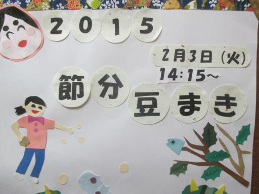 2015.02.02 シルバービレッジ日野東館 素敵な告知 明日は節分ですね。 日野東館でも恒例の「豆まき」を行います。 今年の鬼役は誰でしょうか? ところで・・・この告知はヘルパーの 手作りなんです。かわいらしく出来ていますね! 器用な職員の多いのもシルバービレッジの特徴です! writer: 林 健二
