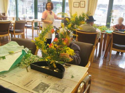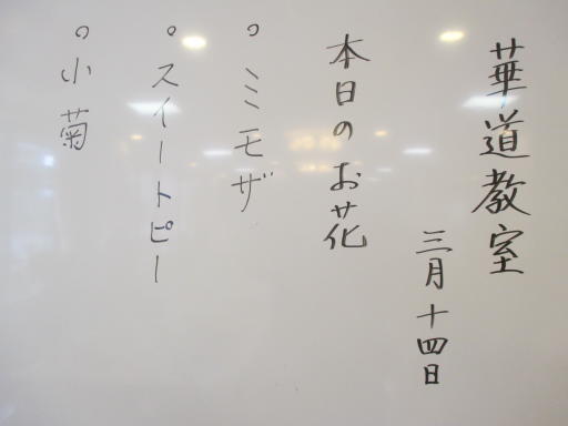 2015.03.15 シルバービレッジ日野東館 華道教室 昨日は華道教室の日。 生けるお花は鮮やかな黄色の「ミモザ」に 薄ピンクの「小菊」。そしてオレンジの「スイートピー」。 とても綺麗な春らしい生け花が出来ました! writer:櫻井 葉月
