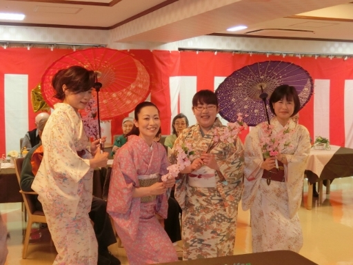 2015.04.09 シルバービレッジ八王子 お花見 パート4(2グループ ) お花見 パート4(2グループ) 3月8日はお花見でした…. と言いたいところでしたが、この日は季節外れの雪が舞う天気。 外での開催はできず、各ホールで豪華なお昼ご飯を召し上がっていただきました。 食事の前には、「満開シスターズ」(他の名前もあり)の美しい踊りが披露されました。 皆様、満足されたご様子でした~~。 来年は、満開の桜の下でのお花見を行いたいものですね~~。 writer: 2グループ 山上 恭一