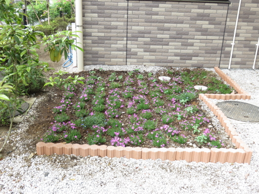 正面玄関から向かって左側の庭に、芝桜を植えました。