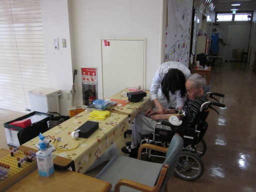 2015.04.20 シルバービレッジ八王子西 本日、健康診断です。 本日、健康診断です。 「ご入居者、春の健康診断」 と 「職員も・・・」です。 普段わからない、体の中を年2回健康診断において 健康管理しています。 やはり・・・ 採血は、お年に関係なく痛いようで・・・ 同情いたします。 writer: 田中 昇