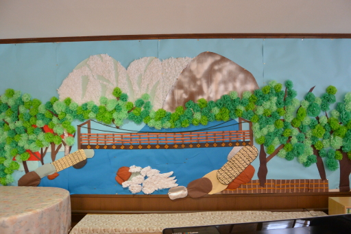 2015.06.05 シルバービレッジ日野 『手芸サークルによる壁画です!!』 『手芸サークルによる壁画です!!』 手芸サークルの皆様が作成していただいた作品です。 北アルプスの麓にある有名な景勝地をモチーフに作成されました。 初夏でも高い山々にはまだ沢山の雪が残り、渓流に架かる橋や、廻りの木々は 青々と色づいている情景が鮮やかに表現されていますね。 手芸サークルの皆様による作品は毎回感心させられます。 次回の作品も楽しみですね!! writer: 倉田 知章