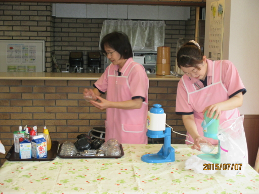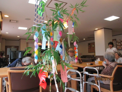 2015.07.09 シルバービレッジ日野東館 七夕です。 「七夕」 本日は七夕で短冊に願いごとを書いて飾りました。 「おいしいお寿司が食べたい」「健康第一」などそれぞれの願いを書いておりました。 皆さんの願い事が叶うといいですね。 本日のおやつは、かき氷です。 少し天気は曇っていましたが、みなさん「おいしい」と沢山召し上がっていました。 writer: 介護部 新田紀子