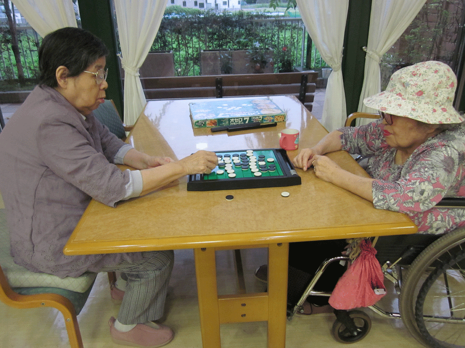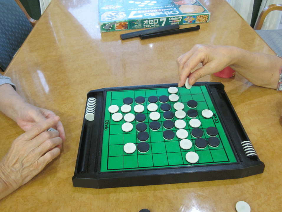 今日もお茶の時間の後に、1階ホールで「オセロ」を楽しんでおられるご入居者がいらっしゃいます。