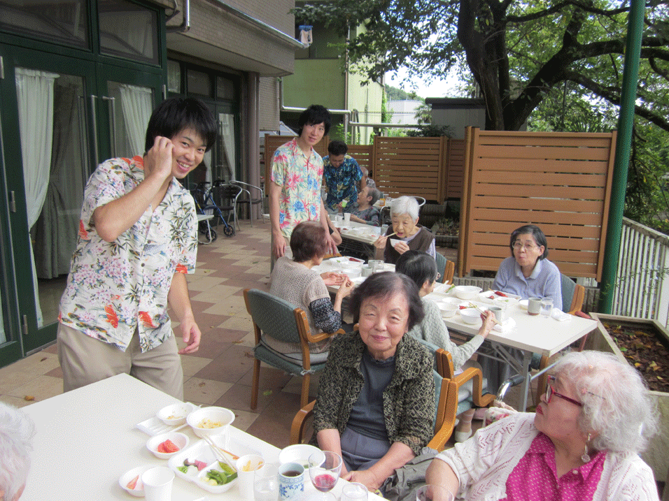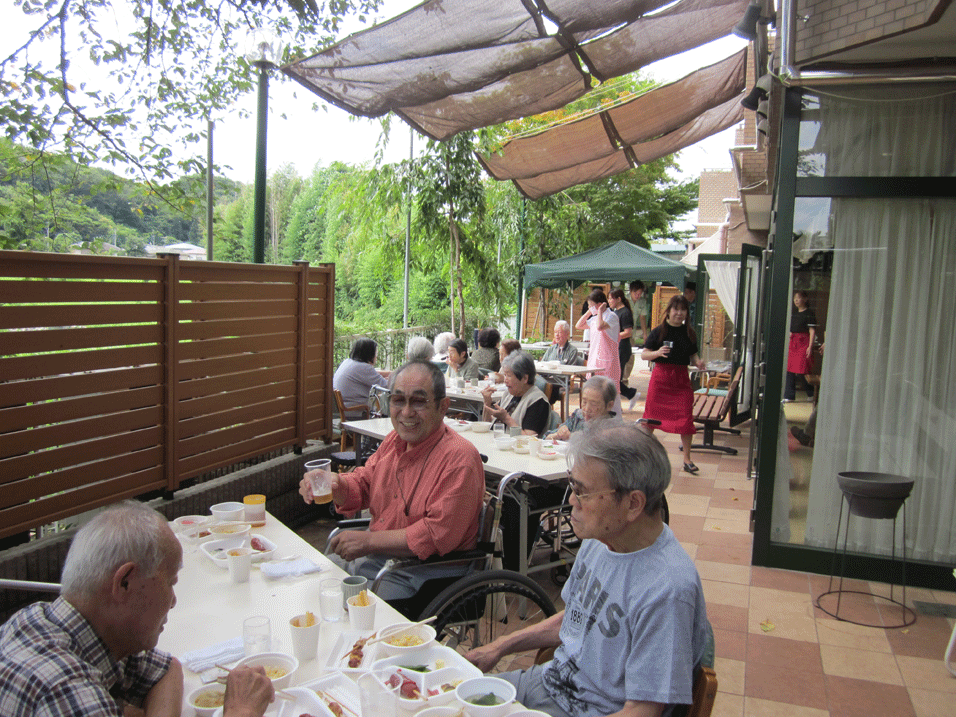 2015.09.02 シルバービレッジ八王子西 ~ビアガーデン~ 8/27 本日、ビアガーデン開催です。夏の締めくくりに思いっきり飲みましょう! という事で、ご入居者と大宴会です。ここ数日、台風の影響で雨の毎日でしたが本日晴天なり。 日頃のおこないが良いのです! フランクフルト、焼き鳥、餃子に冷やしトマトをつまみに・・・ 自慢のテラスで青空のもと、ビール、チューハイ、ワインなど お好きなお酒で皆さん頬を赤らめておりました。 writer 施設長 田中 昇