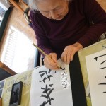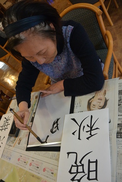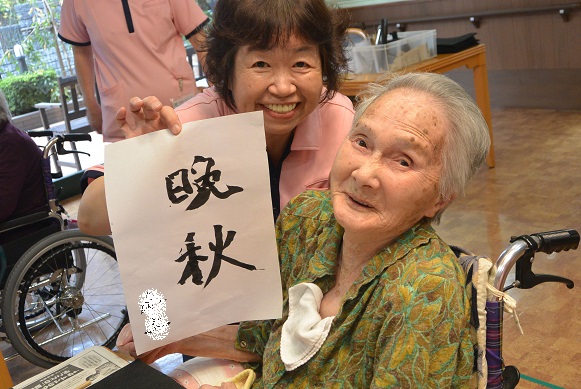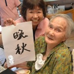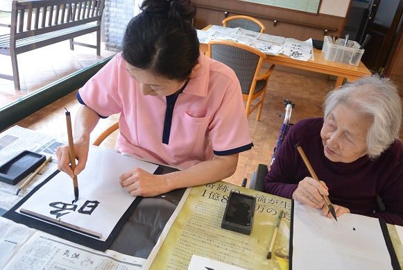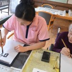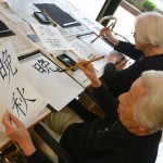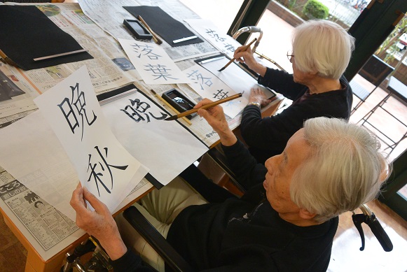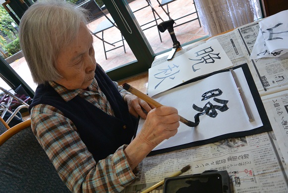 2015.11.16 シルバービレッジ日野 書道 本日は、あいにくのお天気ですがなんとなく気持ちが落ち着く、書道日和ですね(#^.^#) お題は、『落葉』『晩秋』『山茶花』です。 皆さん、とても集中されています!(^^)! writer 介護課 松田 恵里