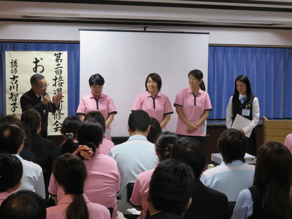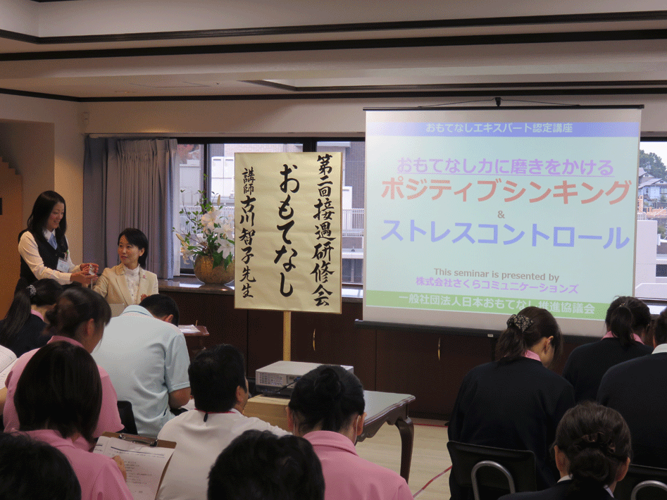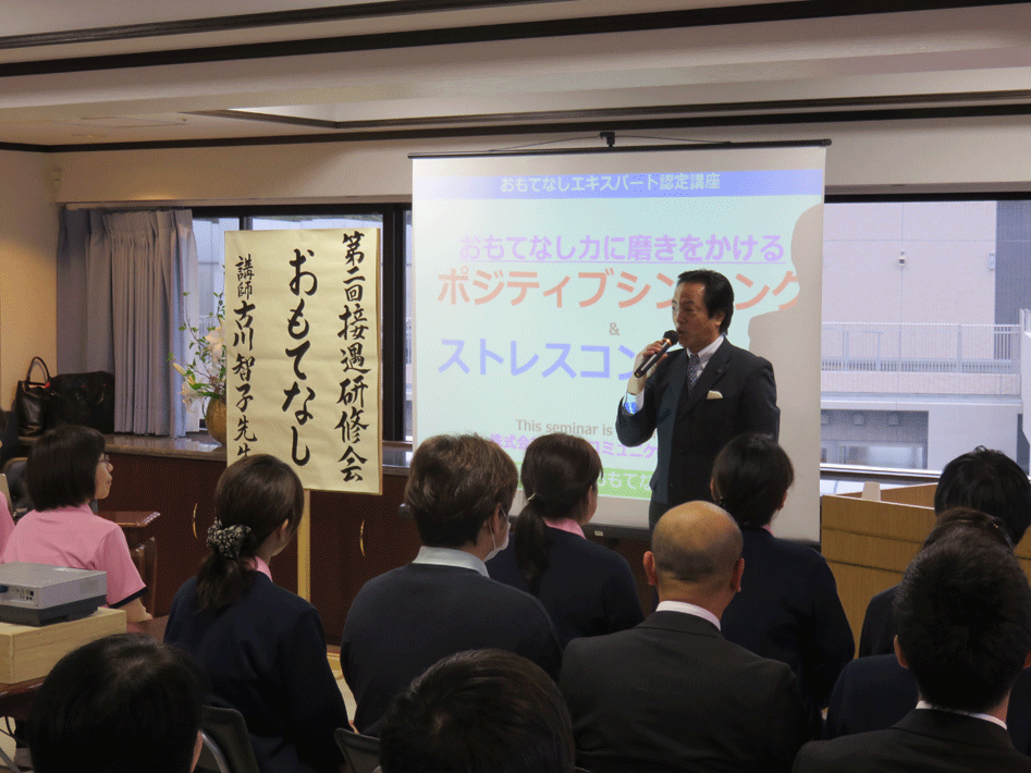 昨年は、「あの人にまた会いたい、と思ってもらうためには」を主として「接遇」「おもてなし」とはの講義でしたが、今年はその「おもてないし」に磨きをかけるために「ポジティブシンキング」を主として、講義をして戴きました。