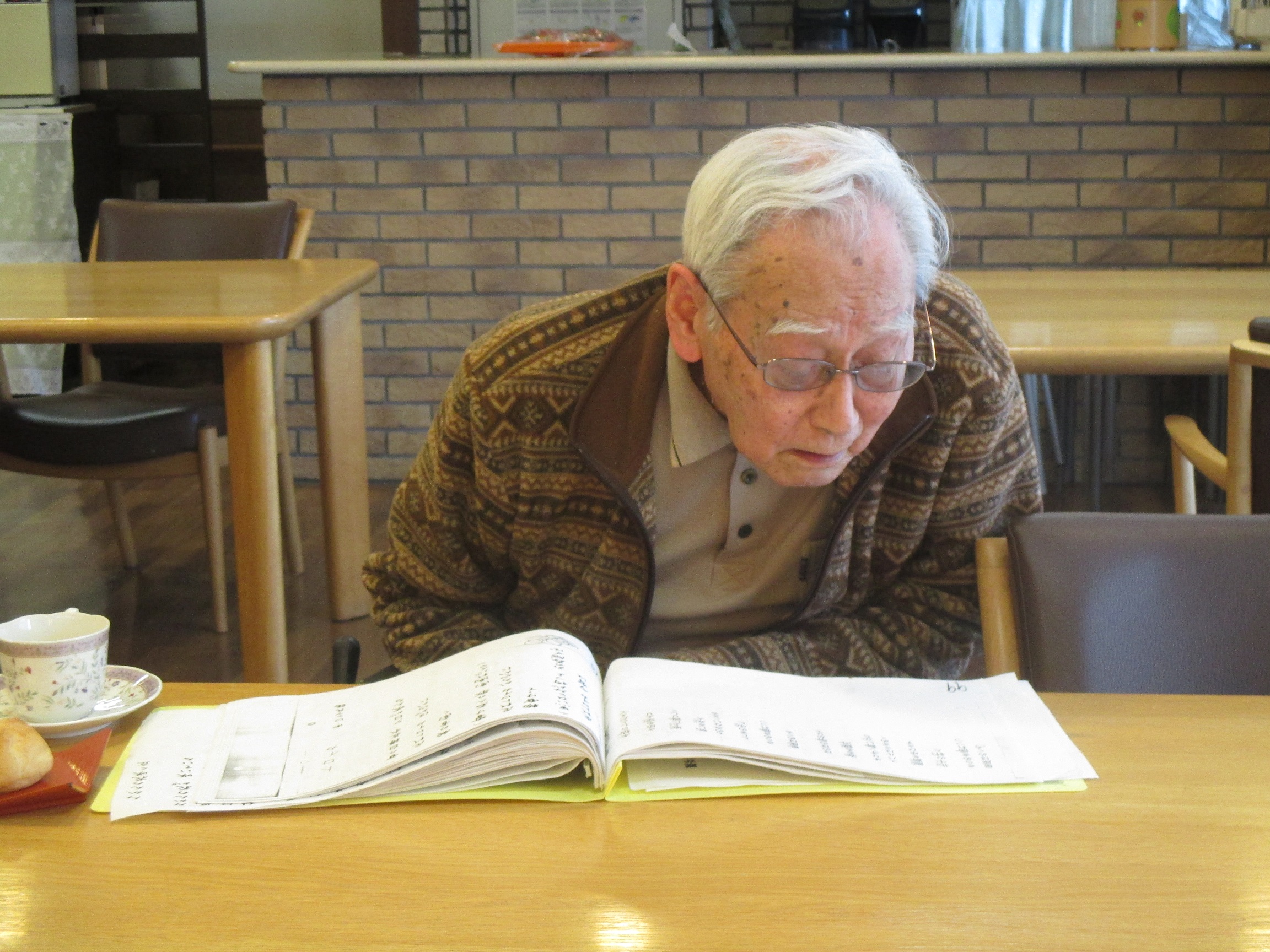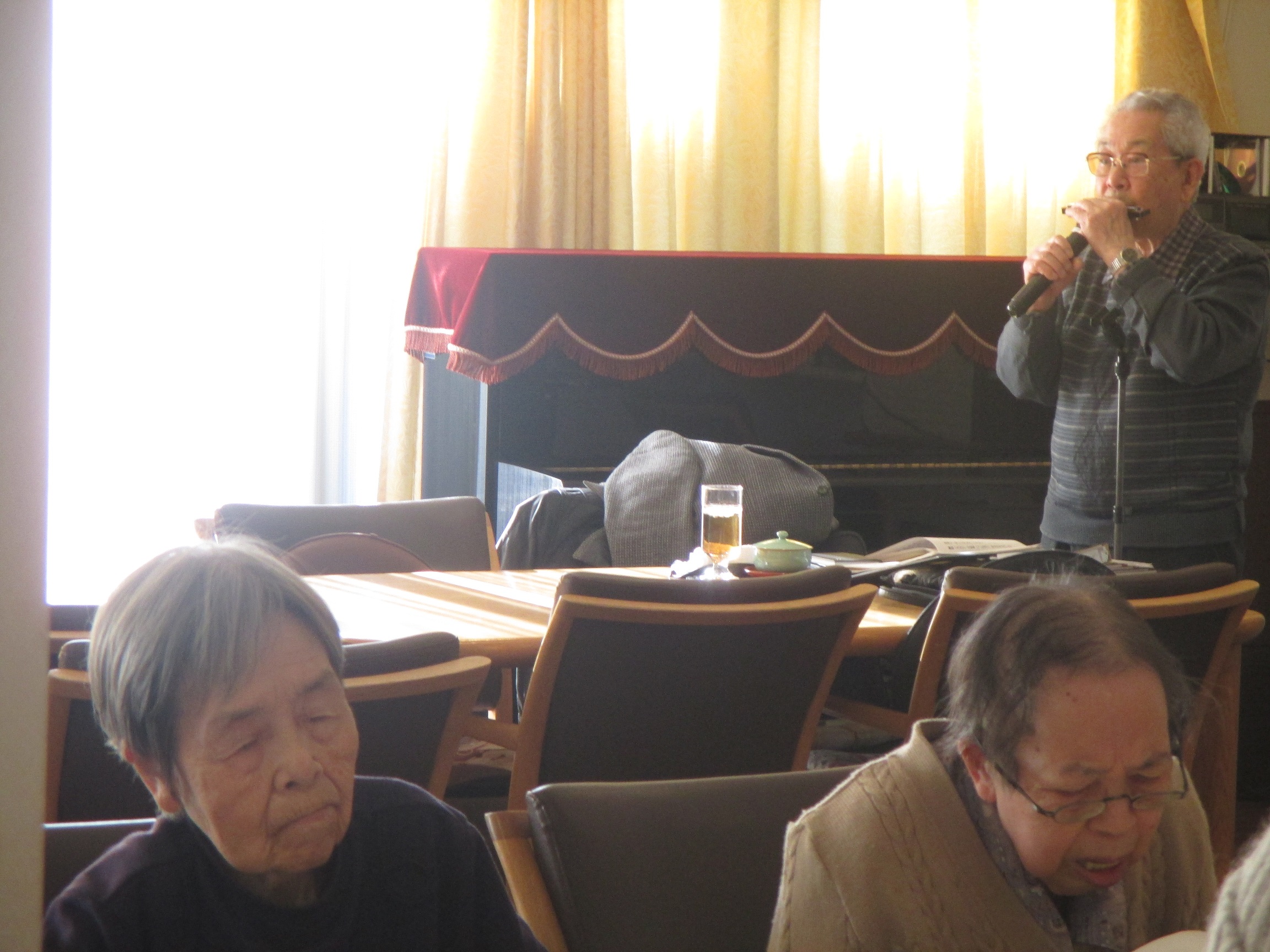 ご入居者のご要望を聞いて即興で演奏し、ご入居者の皆様が歌を歌ったり、目を閉じて聞き入っている方もいらっしゃいます。