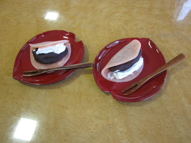 ホットプレートで焼いた生地で、あんことホイップクリームを巻きました。
