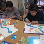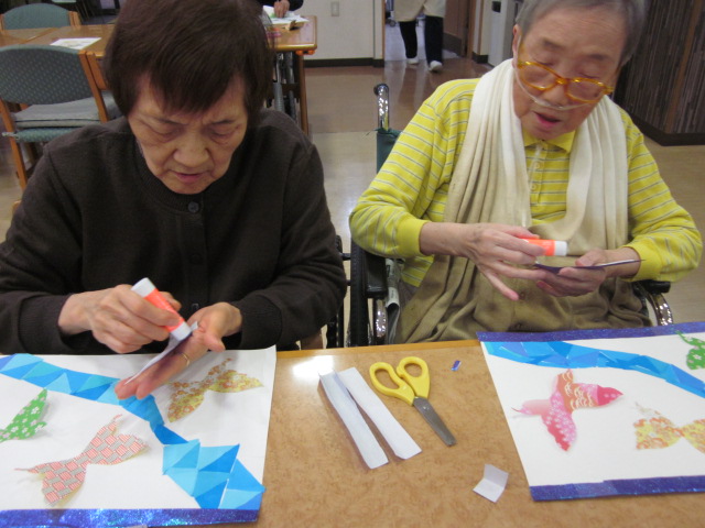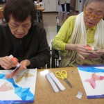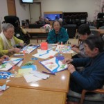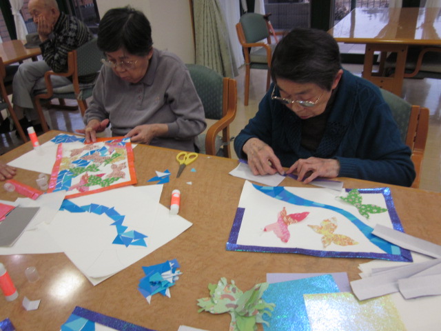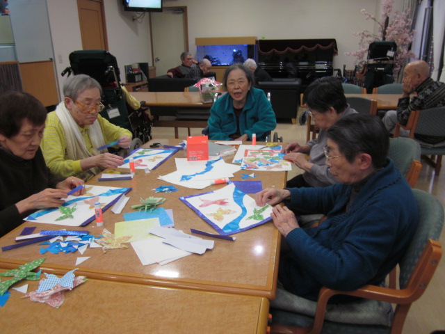 賑やかな ひな祭り会が行われ、一息ついた所で外の景色に春の訪れを感じ皆で、歓談しながらちぎり絵で春の景色を作ってみました。「お部屋の白いカベが明るくなるね」と笑顔が見られていました。
