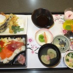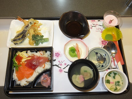 昼食は、海鮮ちらし寿司、はまぐりのお吸い物、エビと春野菜の天ぷら盛り合わせ、
