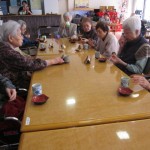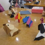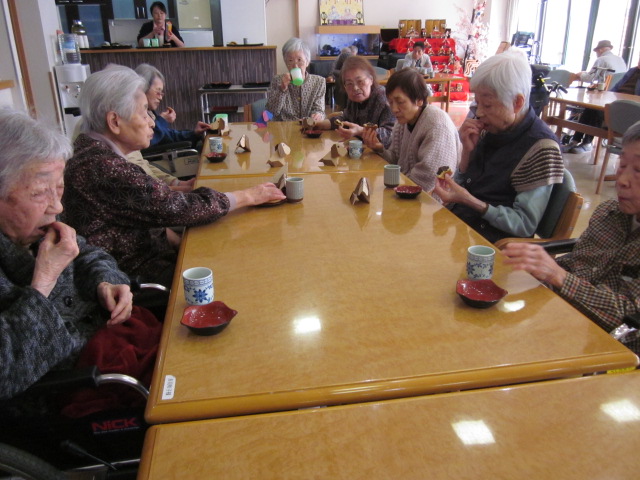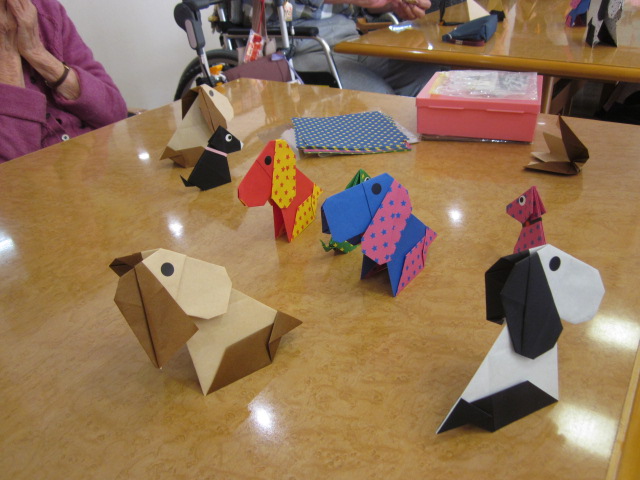 本日(3/5)折り紙教室を行いました。先生は今月の八王子広報に掲載されたボランティアの江坂千恵子先生です。「これが観音折り 」「手を入れてピアノ折り」「次に半分に折ります、皆さん随分慣れてきましたね!」「ペラペラの所を引っ張って頂くとワンちゃんの頭になります」と作りながら先生の説明を聞き、又、分からないところは手伝って頂いて楽しそうにも真剣に作っておられました。「なんだか私のは、餌あげていないみたいで、やせっぽちの犬になっちゃった!」等の声が聞こえてきました。折り紙教室の後はお茶を召し上がり、ついでに昔、飼っていた犬の話で盛り上がっていました。