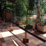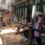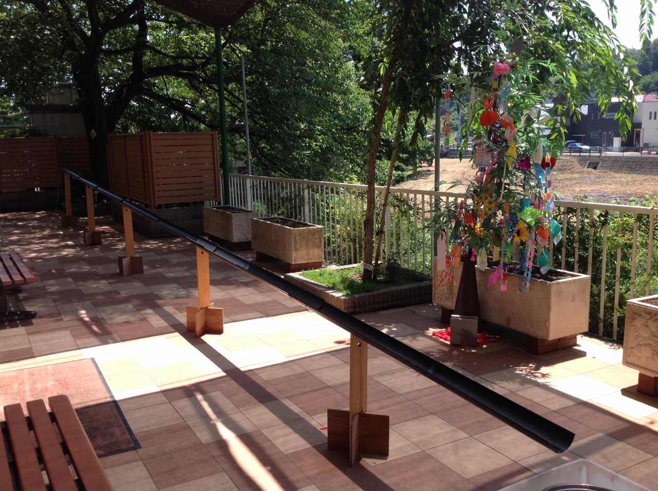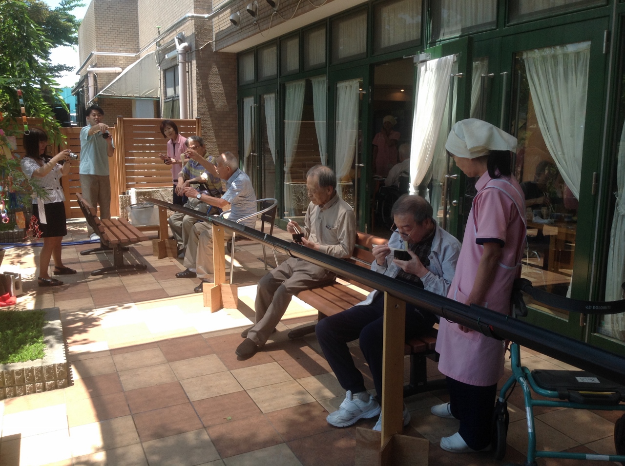 毎年恒例の七夕の日に行う「流しそうめん」をいたしました。自作の流しそうめんキットをテラスに設置して準備完了です。全長15mの流しそうめんキットにホースをセットして、ゆっくりと水を流します。あまりスピードをつけるとご入居者がそうめんをすくい辛くなるので、水量を調整します。