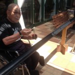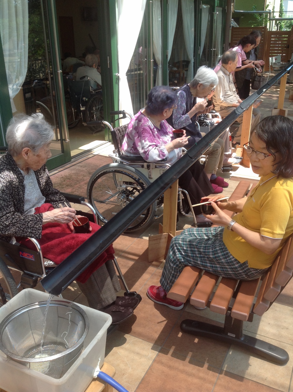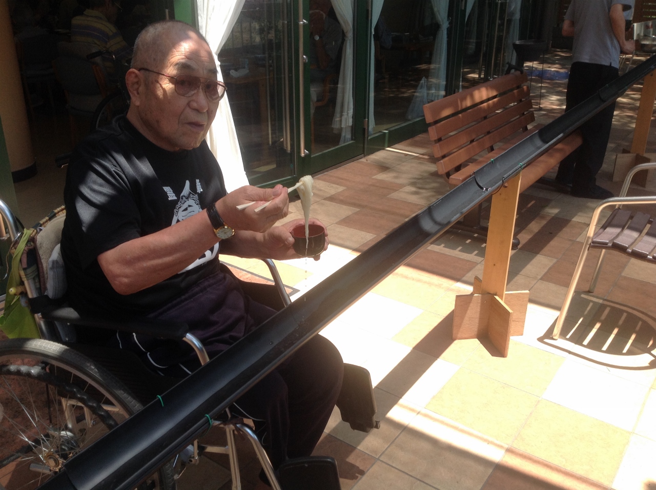 ご入居者が順番に流しそうめんを楽しみます。お腹がいっぱいになったという方も、流れてくるそうめんを見るとつい手を伸ばしてしまうようです。
