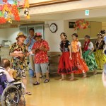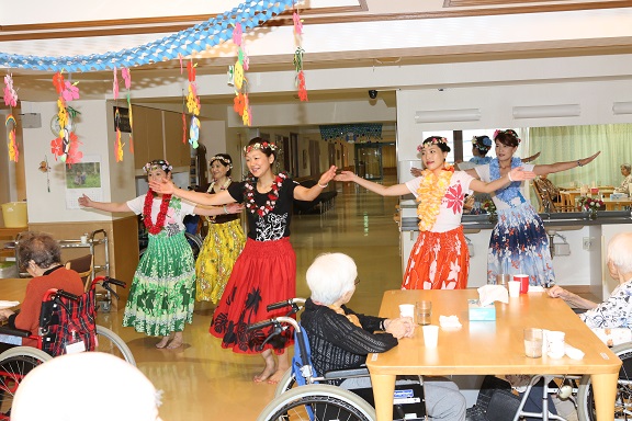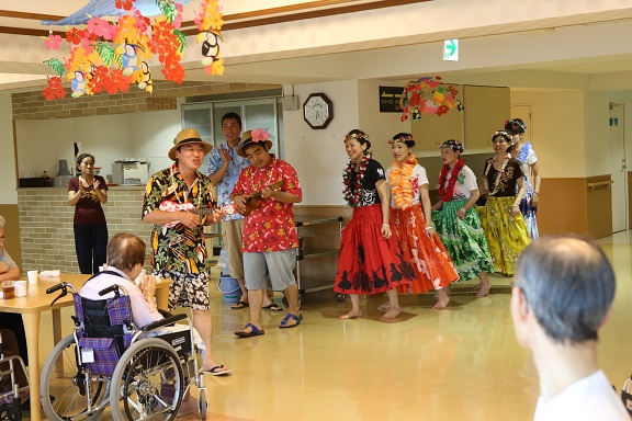 フラダンス、と言えば、田口係長ですね!田口先生に教わりながら、職員華麗に踊りました! また、長谷見専務と大橋課長がウクレレで伴奏を務めました。生演奏でしたので、アロハーという 雰囲気が出てました。