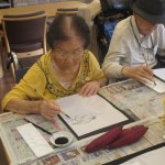 筆を使って細い線や太い線を使い分けて皆様素敵な絵手紙を書いておりました。