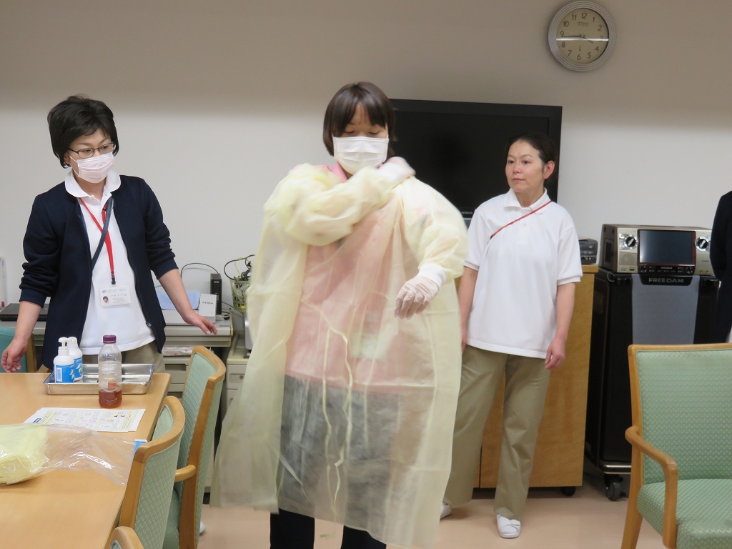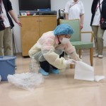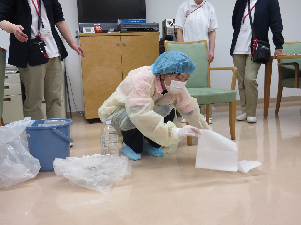 また勉強会では、ノロウイルスに罹患した方への対応方法を実践して学びました。