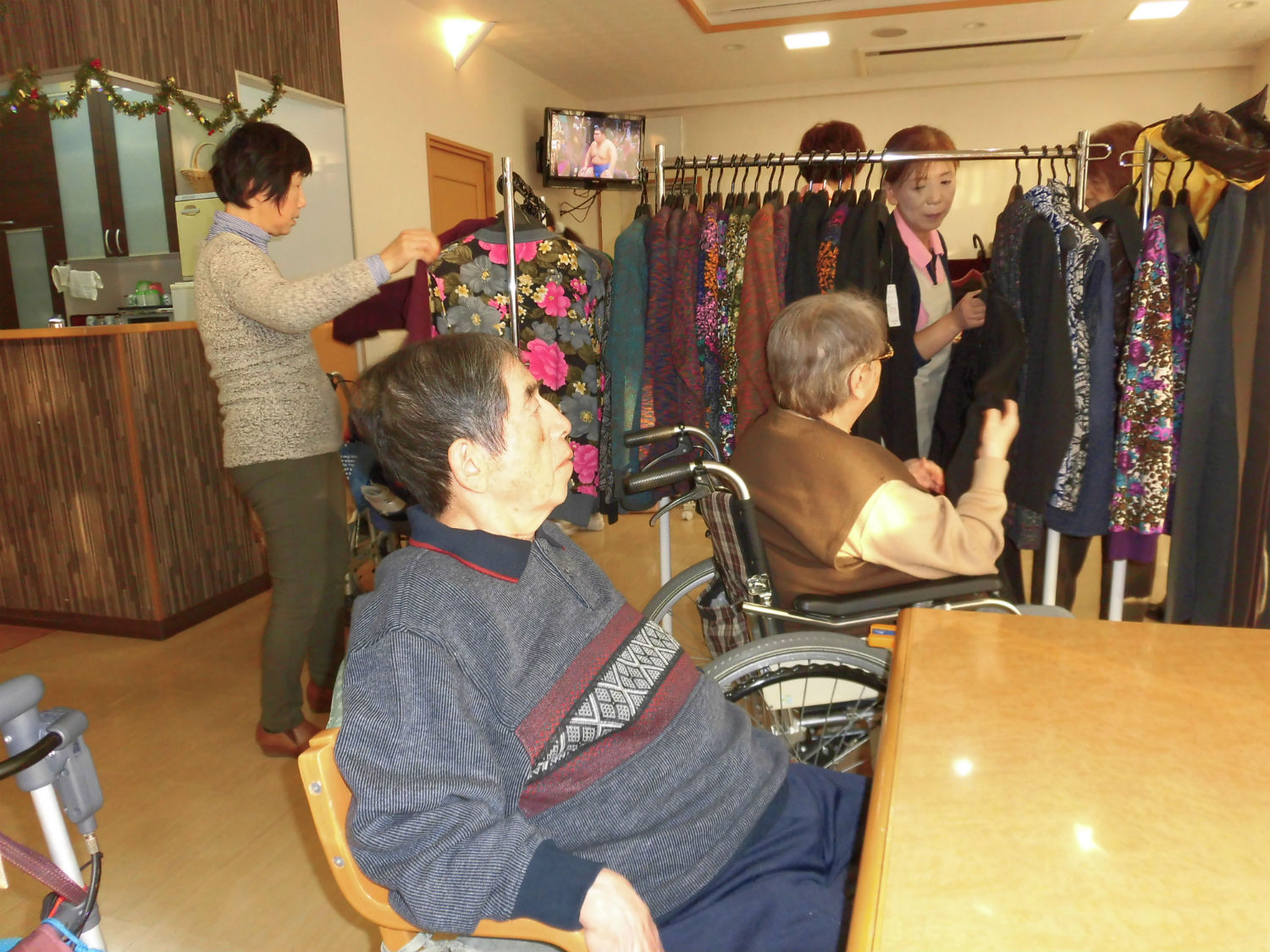 八王子西では訪問衣類販売を開催致しました。1階ホールにはたくさんのお洋服が並べられ、皆さんお好みのお洋服を探しておりました♪