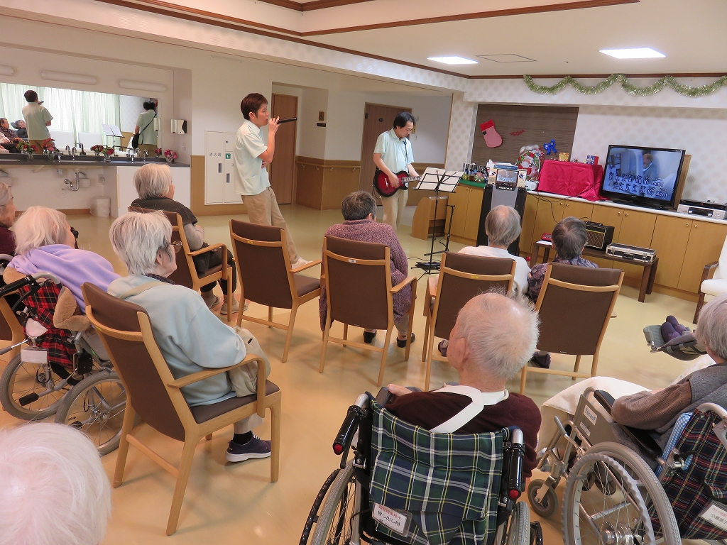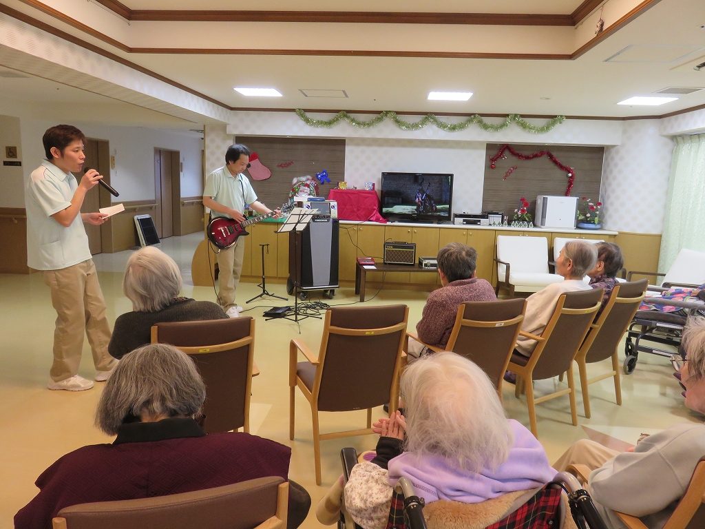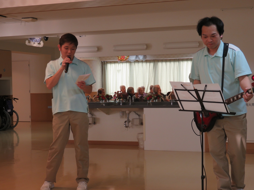 今回は介護部、宇賀字副主任、斎藤さんにおけるエレキギターの演奏会です。