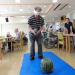 タオルで目隠しをされたご入居者がゆっくりとスイカに接近。