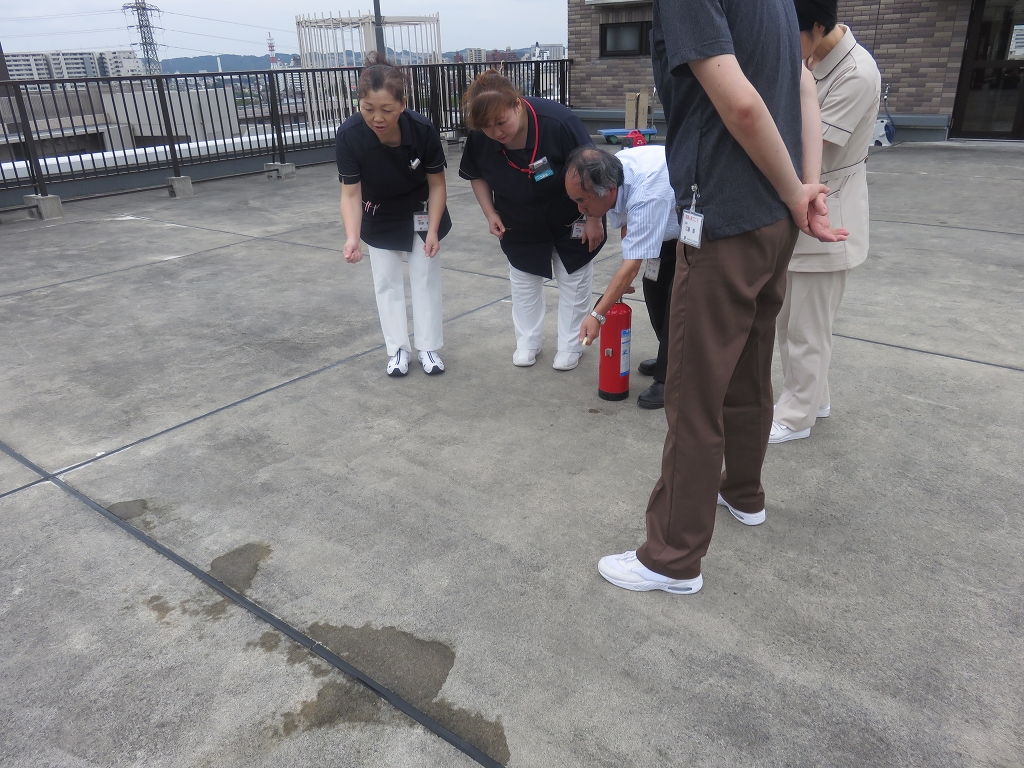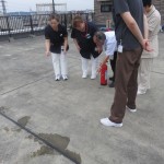 業務部の小阪さん指導のもと、水消火器での消火器の使用方法