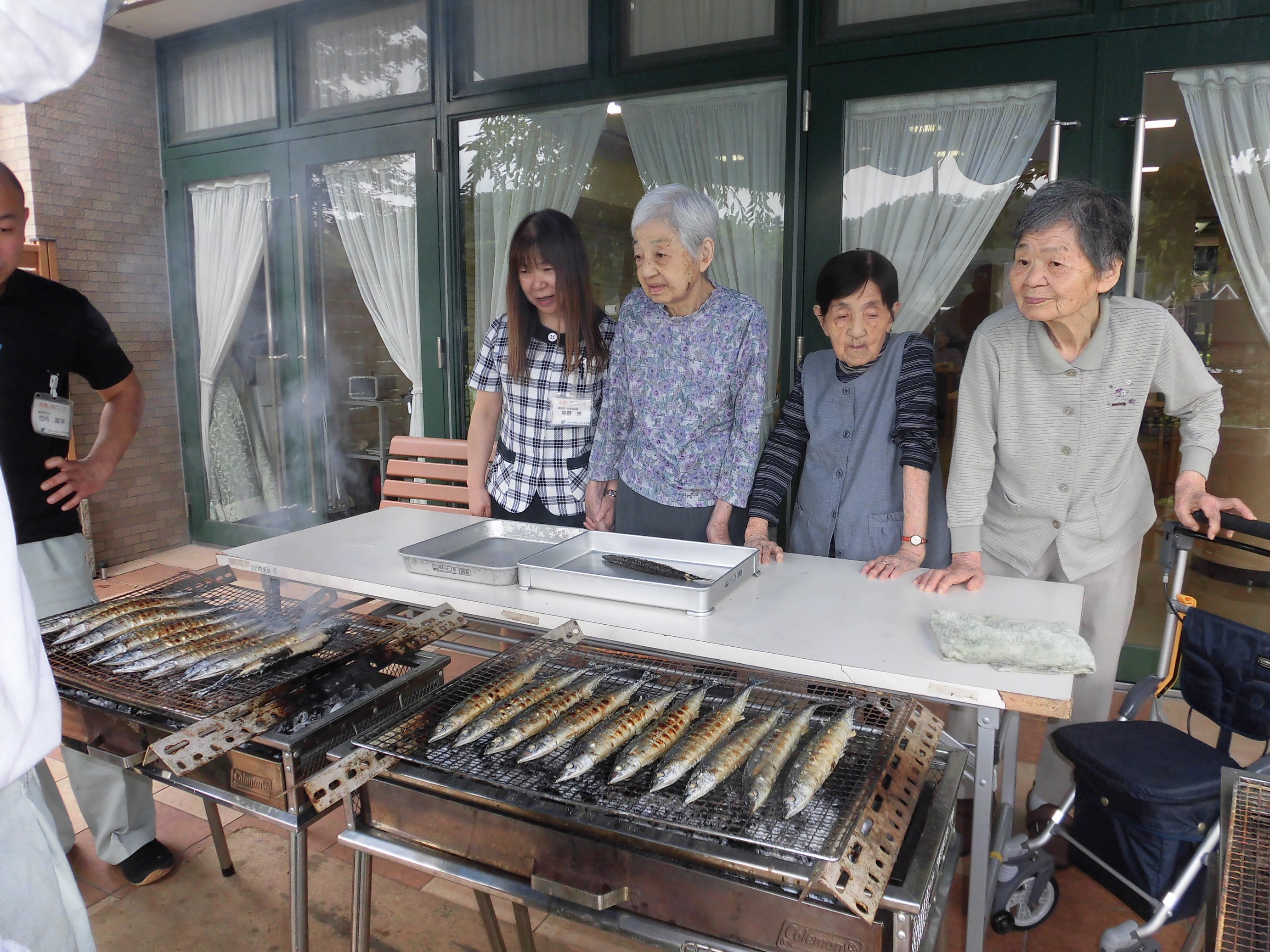 9月28日(木)1階テラスにて炭焼きサンマを行い