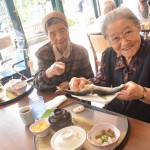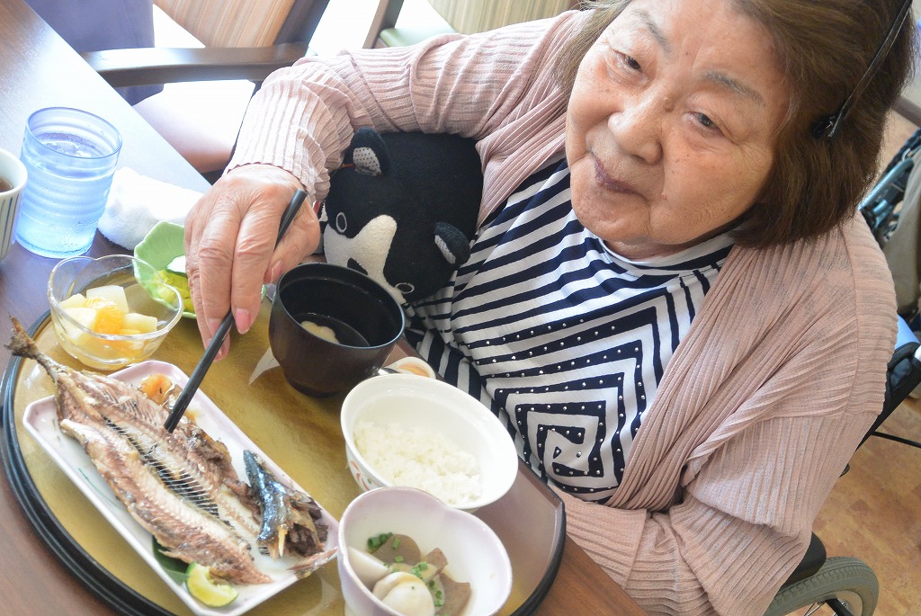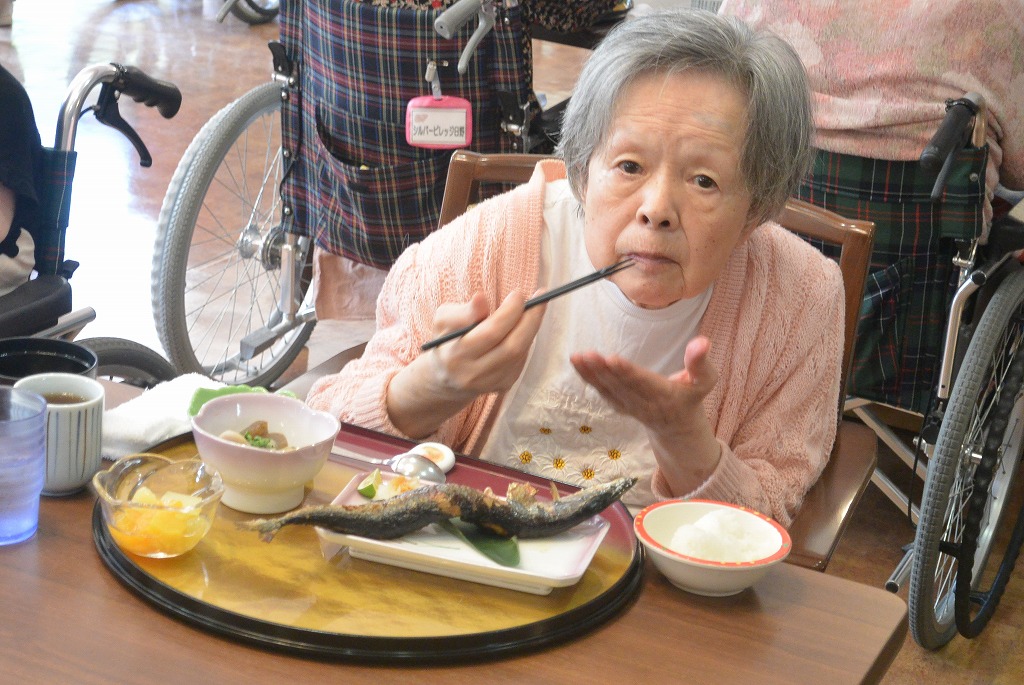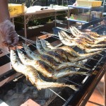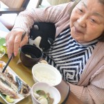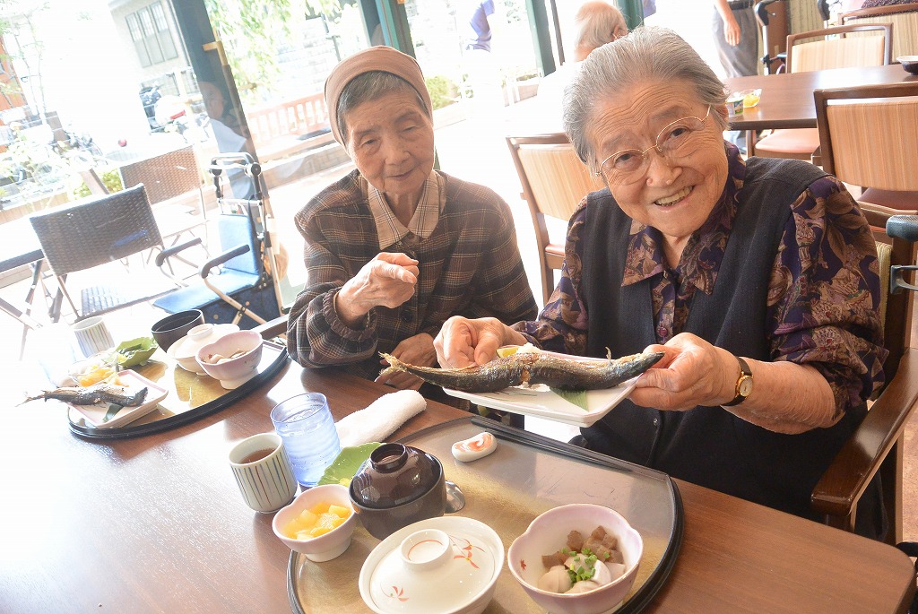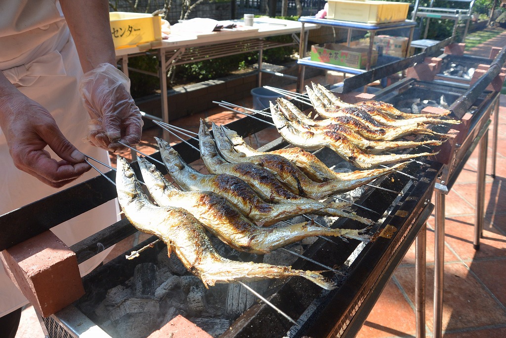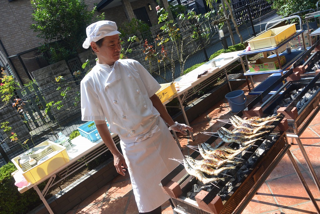 本日はテラスで秋刀魚を焼いて皆様の昼食に