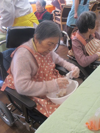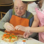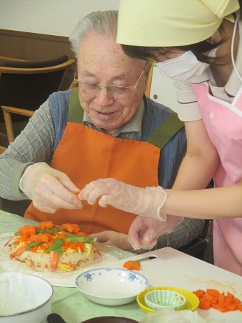 にんじんを型抜きで切り抜いて頂いたり、サーモン錦糸卵を切って頂いたり♪