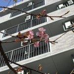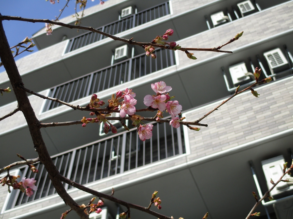 八王子施設、1階テラス前に河津桜があります。