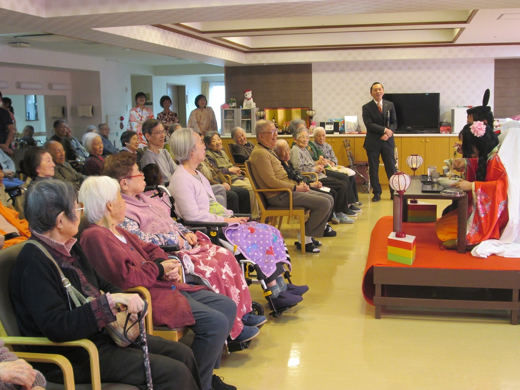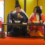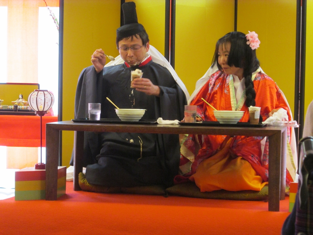 お内裏様と、お雛様にふんした職員が、アツアツのお蕎麦とケーキを食べました。