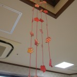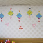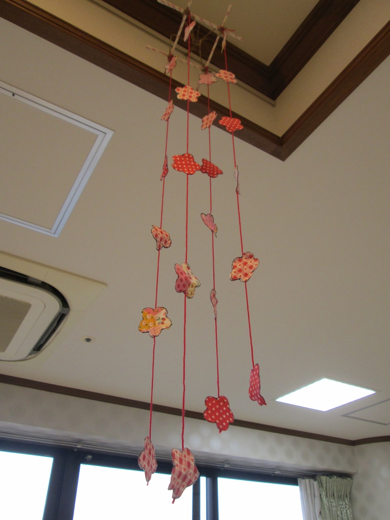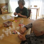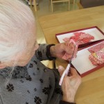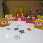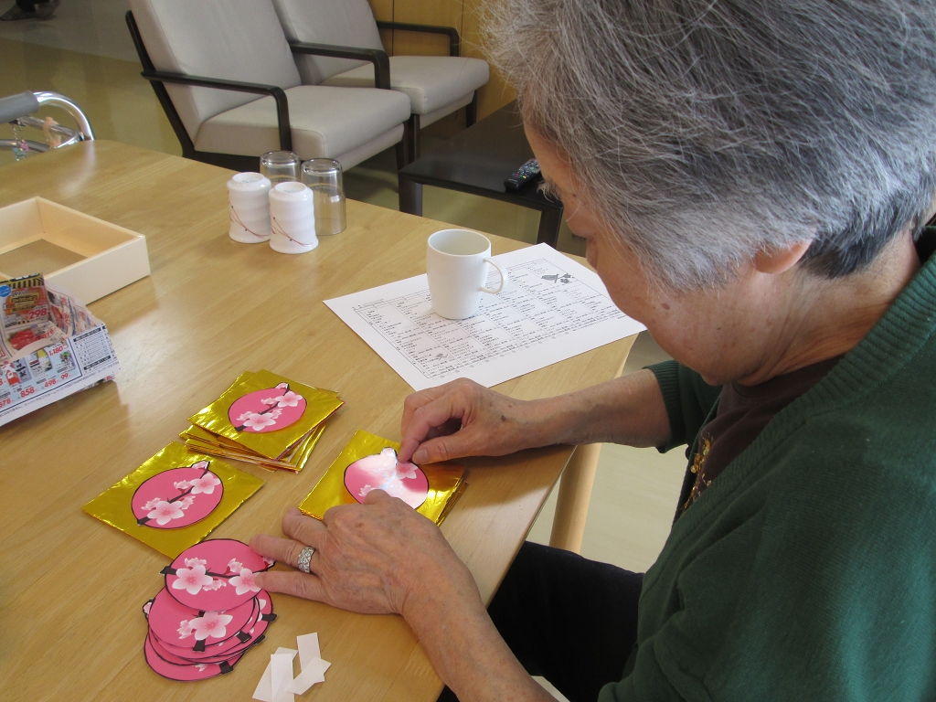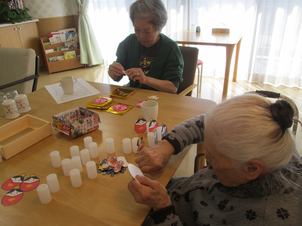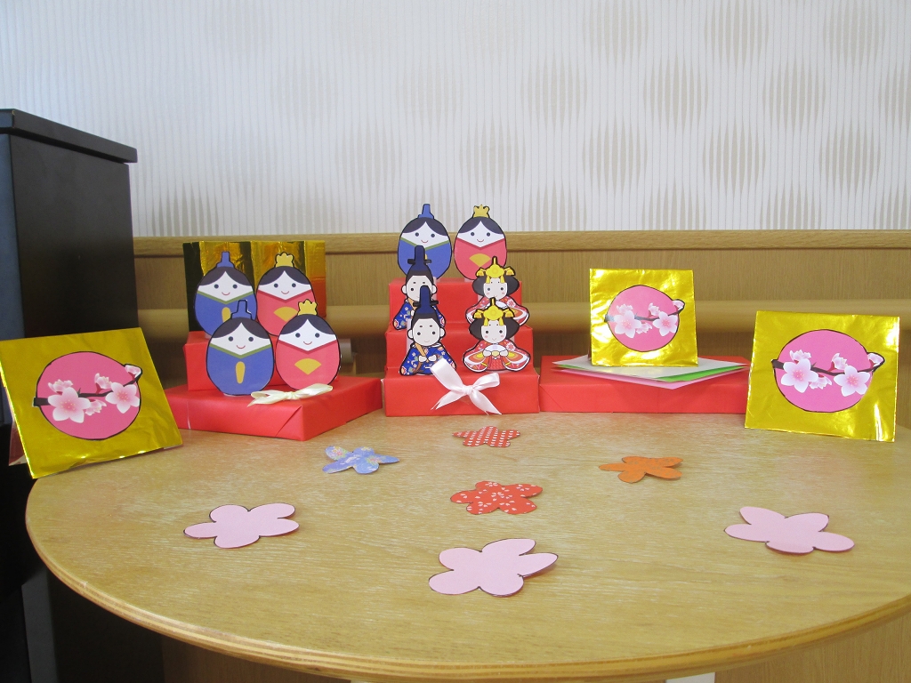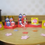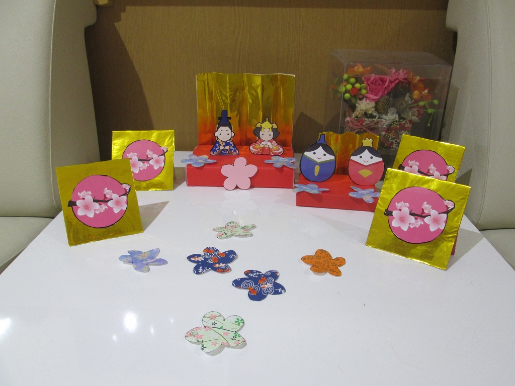 お雛様の切り絵をフィルムケースに貼り、桃の花の切り絵は金色の台紙に貼り手作りの