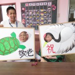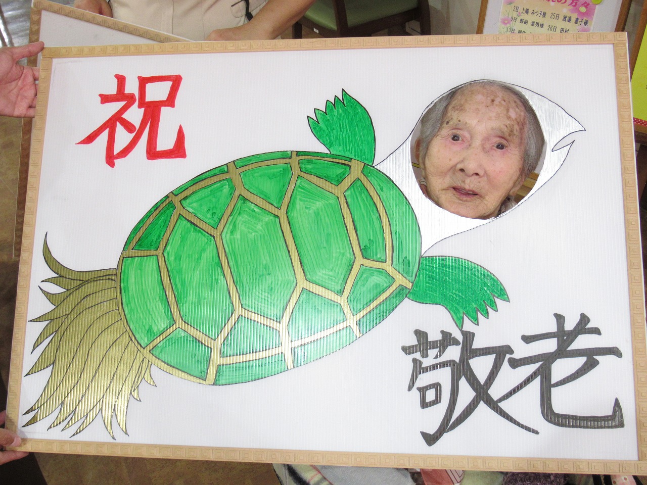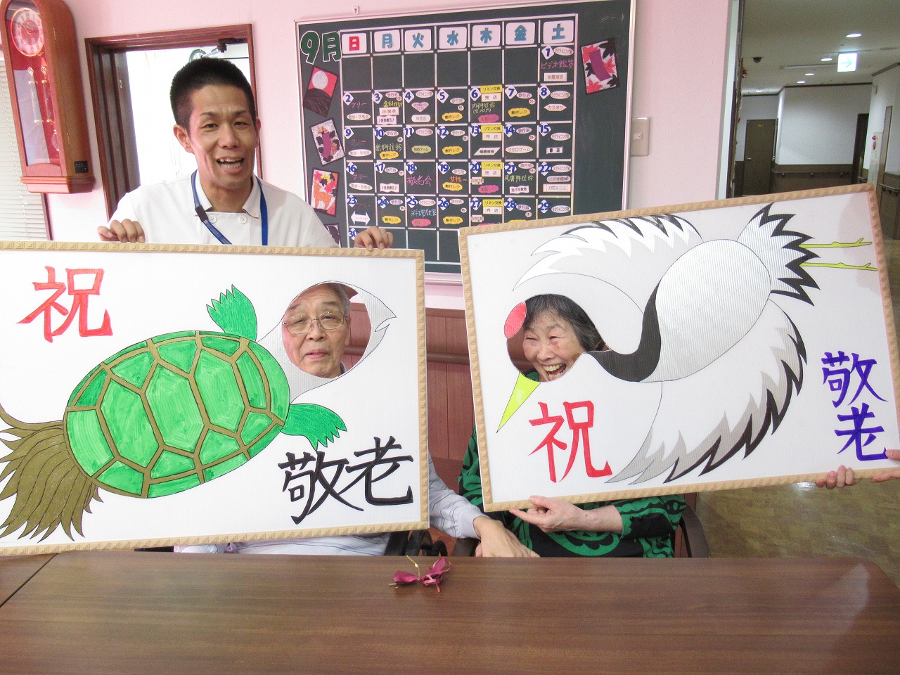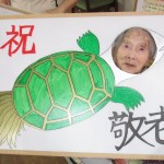 敬老会の記念撮影用に手作りした『鶴と亀の顔出しパネル』も好評で