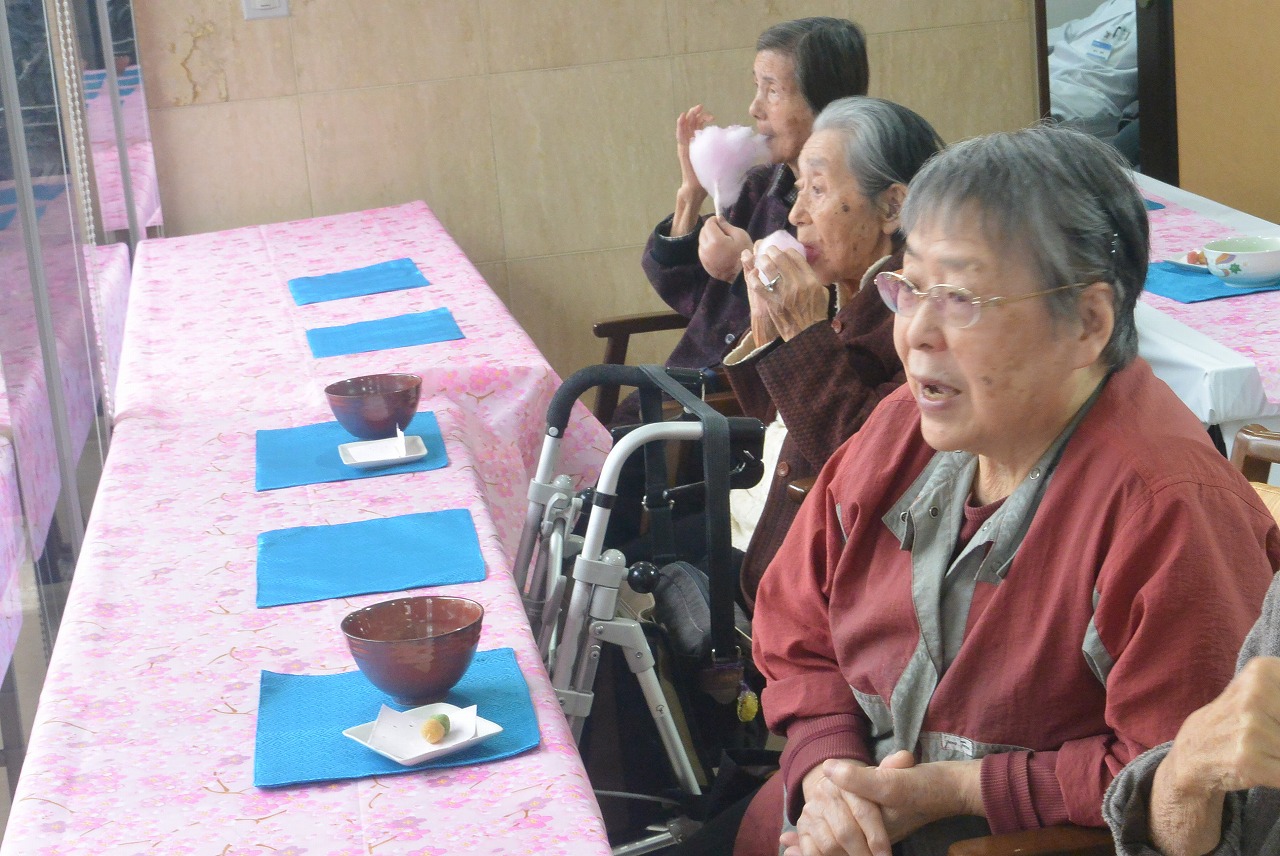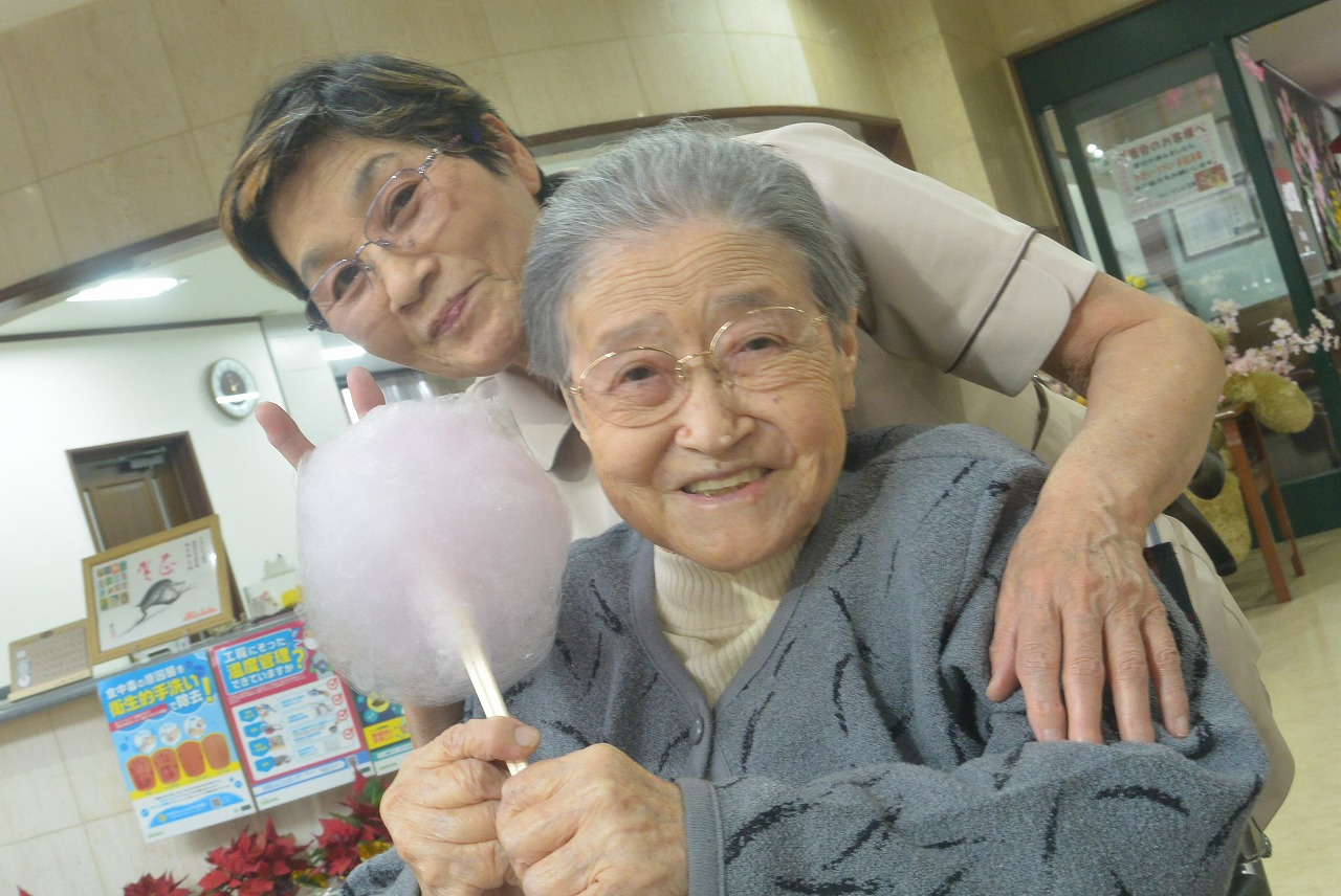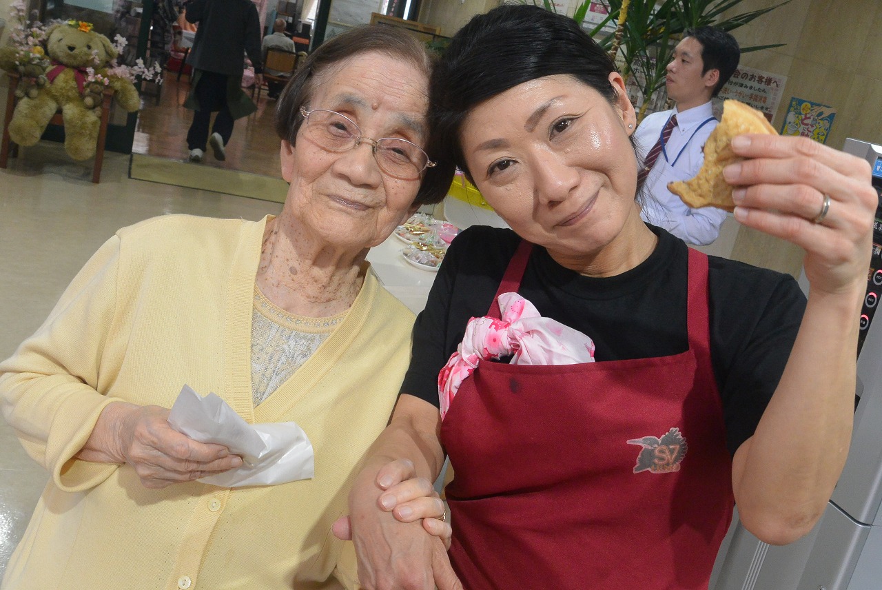 エントランスで職員が作るさくら色の綿菓子や、焼きたての手作りたい焼きを、