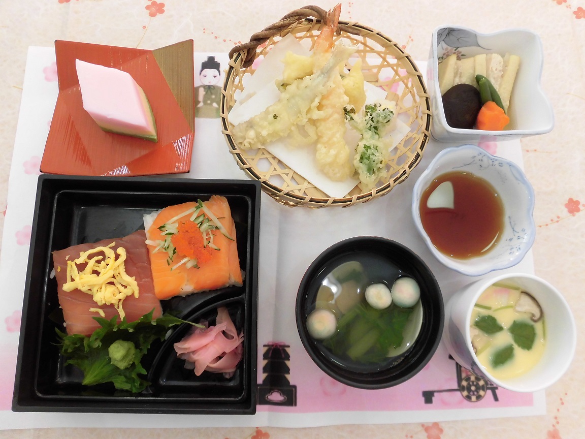 昼食では、海鮮押寿司、蛤のお吸い物等豪華な食事をご提供しました。