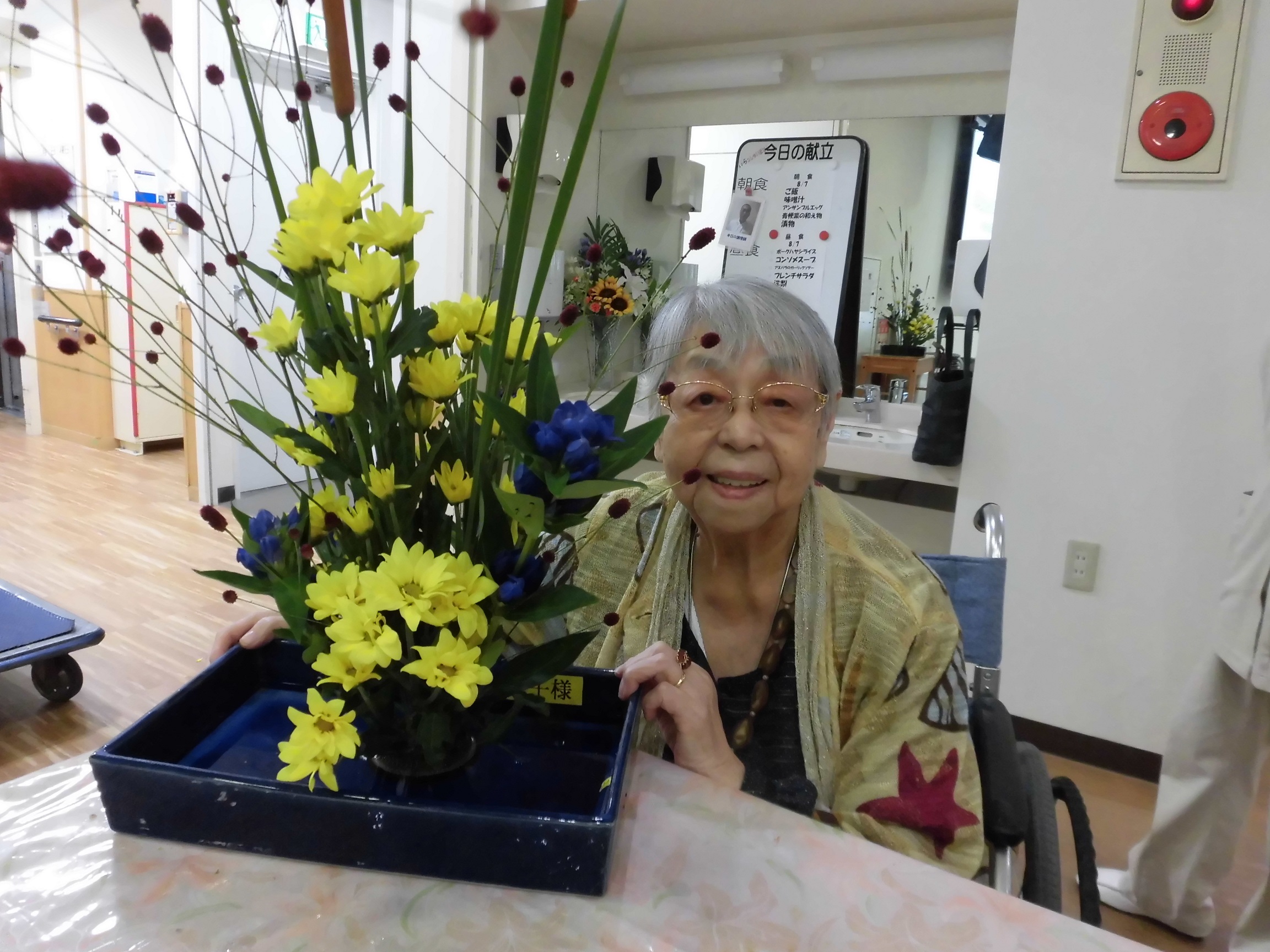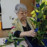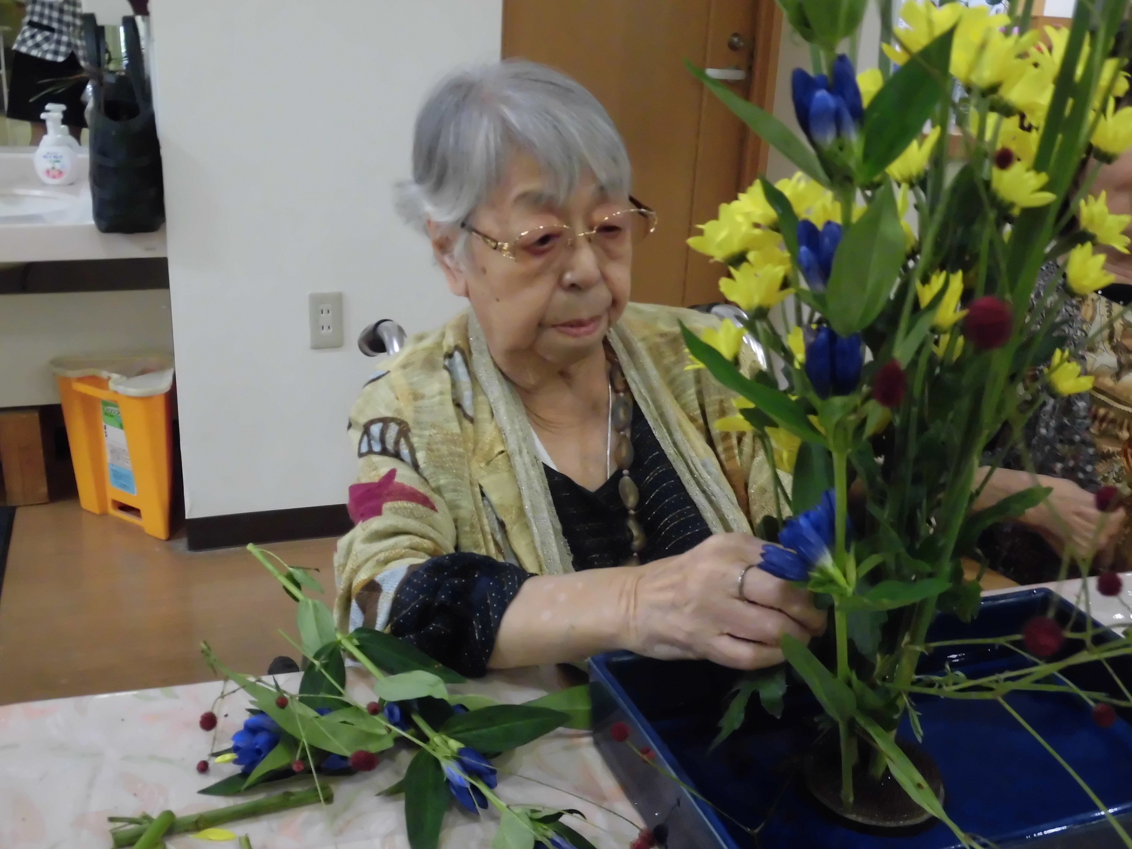 今回使用した花は、「ガマ」「菊」「リンドウ」「リレモコウ」を生けました。