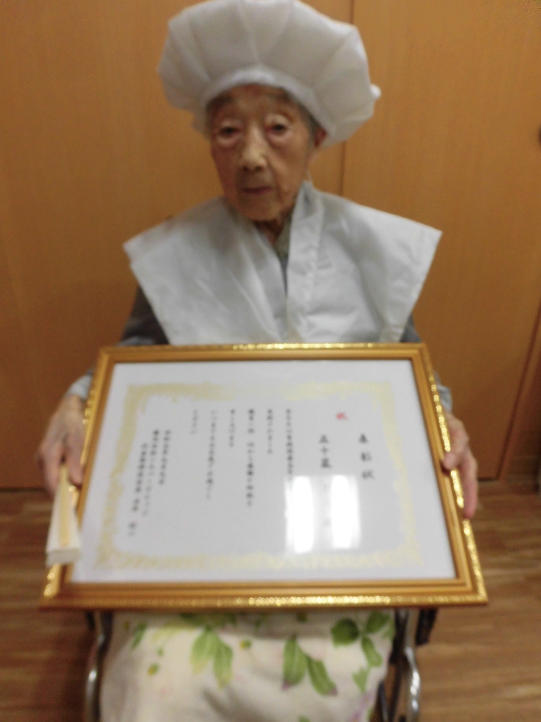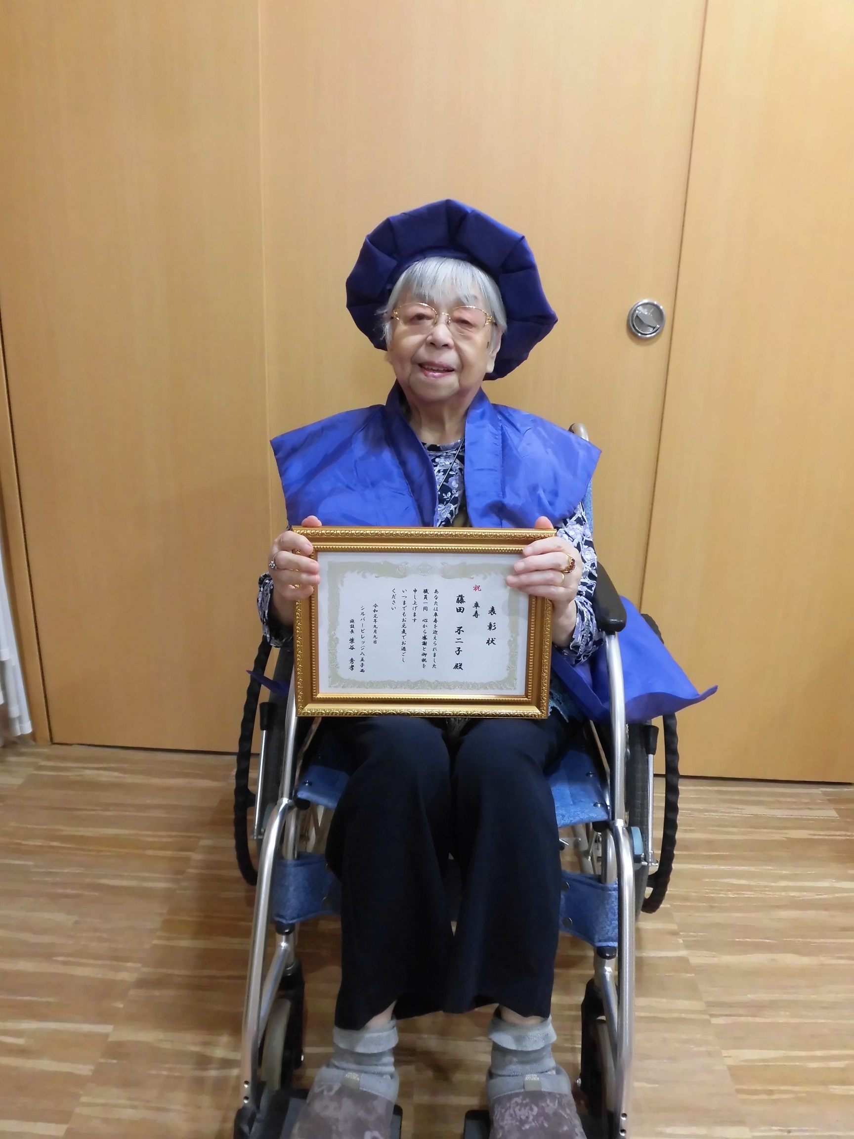 その中で、4施設の中で最高齢となる105歳のご入居者がいらっしゃり長寿を称え表彰されました。