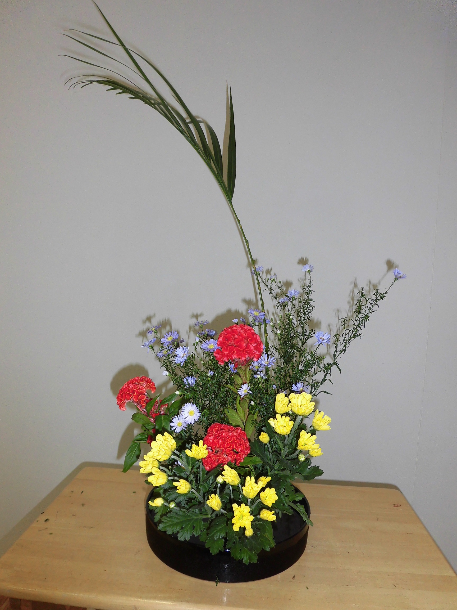 今回使用したお花は、「アレカヤシ」、「孔雀草」、「チイト」、「スプレー菊」です。